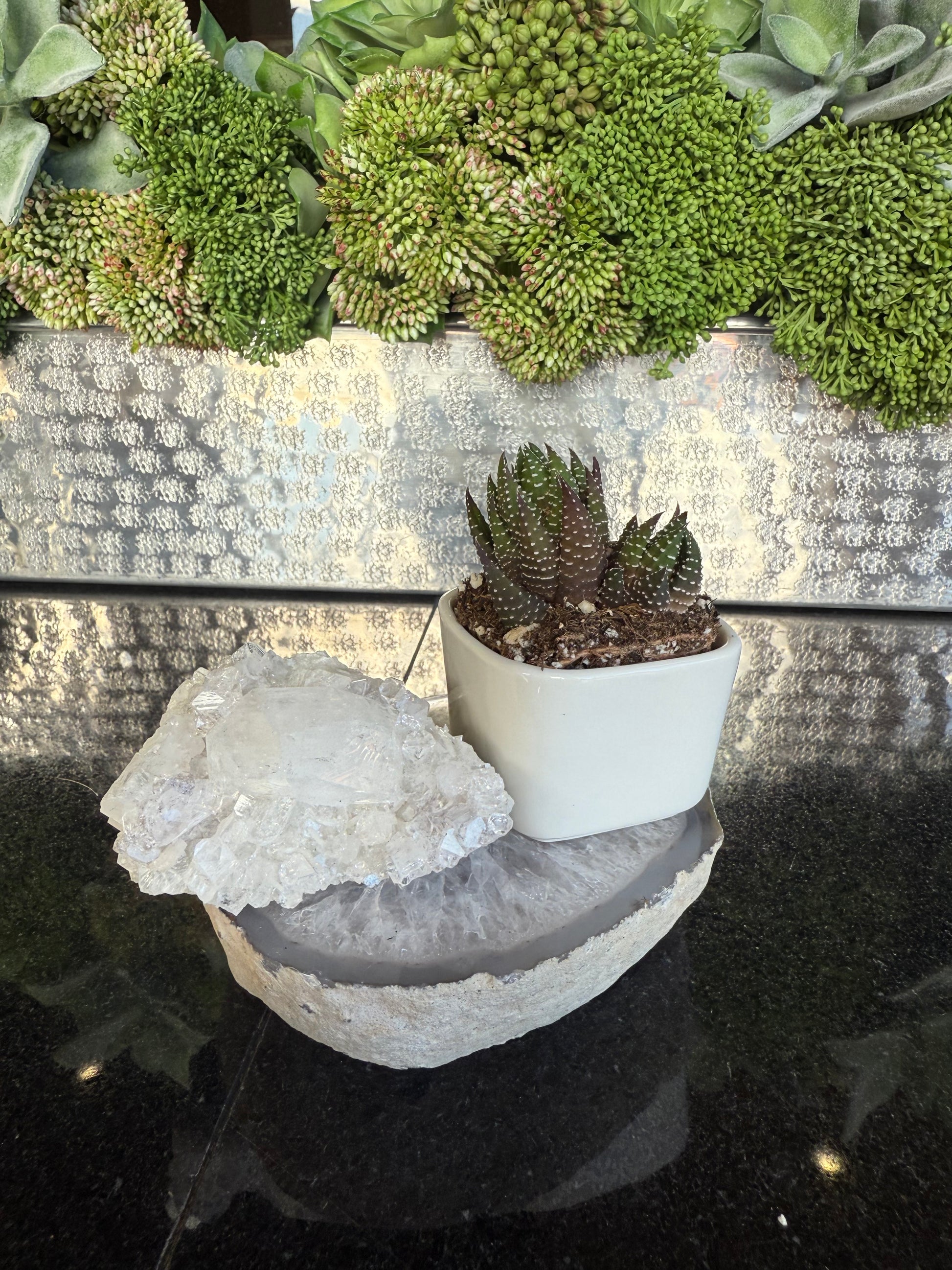 Each piece is thoughtfully curated to elevate your crystal display—perfect for bookshelves, desks, windowsills, or meditation spaces. The vibrant life of the succulent pairs beautifully with the grounding energy of the agate and the brilliance of the mineral specimen, creating a display that feels both luxurious and organic.