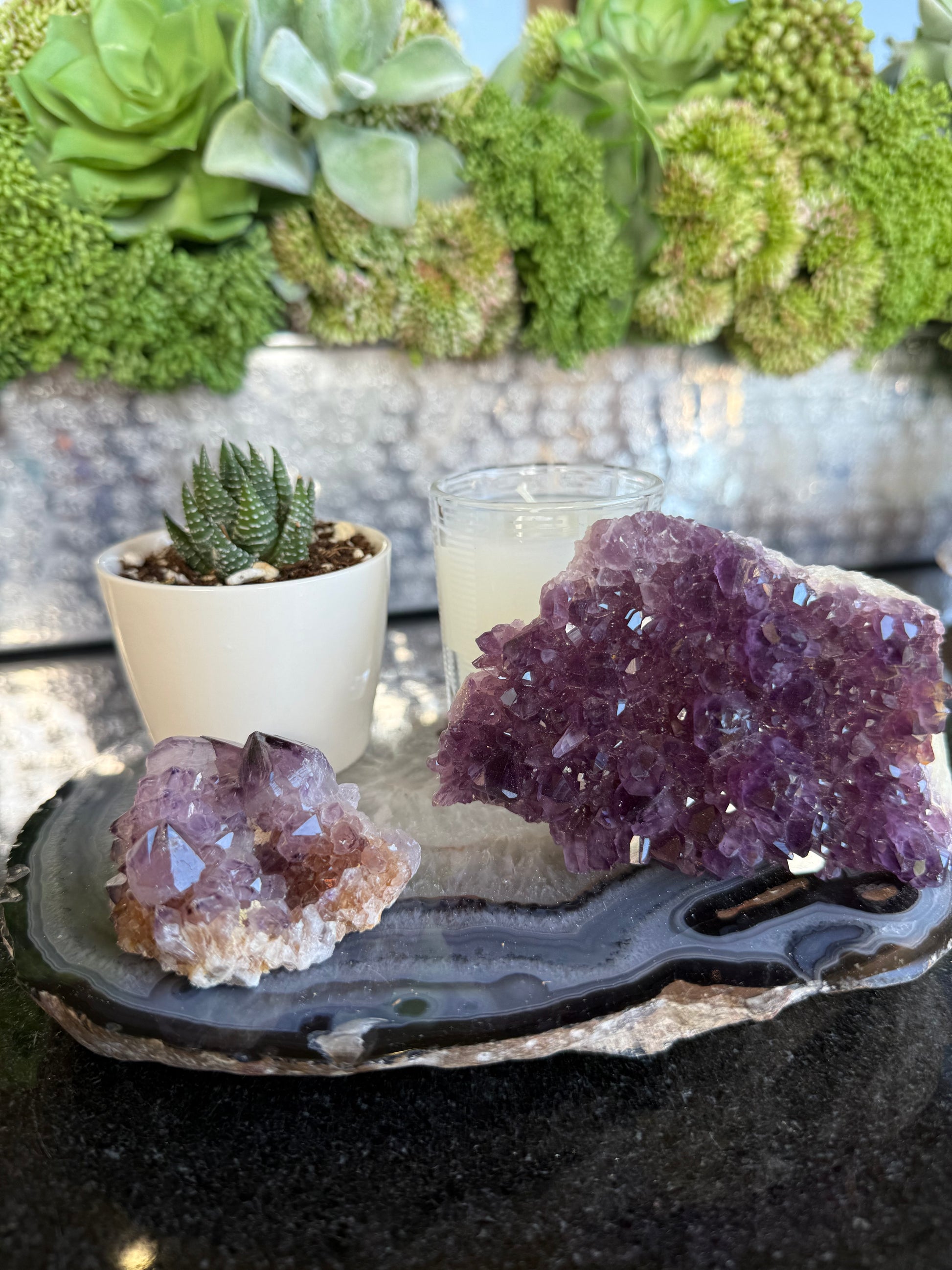 Create a peaceful, elevated display that brings nature and light together. This curated Crystal Display Kit features two hand-selected mineral specimens, a California-grown succulent, and a mini candle, all beautifully arranged on a polished agate slice.